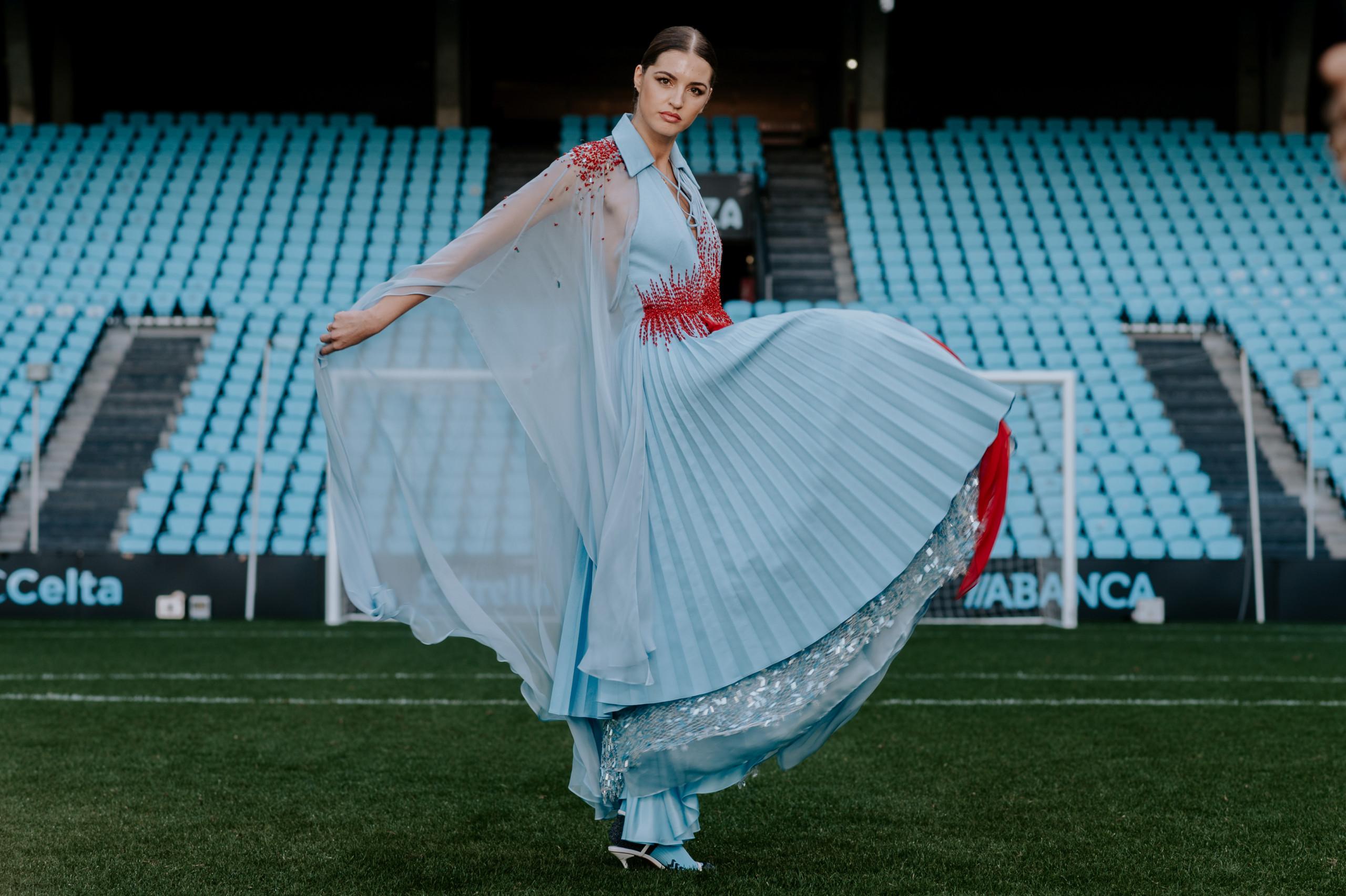 This authentic jewel was created by designer Isabel Núñez, who, with a family in Vigo and strong roots in Galician traditions, has been able to capture our history and origins through fashion. he rough fabric for its production was made of rustic silk, which symbolizes the nobility and authenticity that characterize us. Inspired by traditional Galician dress, Inuñez designed a layered skirt with pleats through the outer and inner layers finished with a hand-embroidered cotton mesh net in blue tones. This detail connects us with the sea and pays tribute to the hard work of so many Galician women who live for it. urthermore, the neckline of the dress recreates the neckline of the first official Celta t-shirt, a spark of our origins. The most special touch of this creation is a spectacular crystal hand embroidery in vermilion tones, for which 100 hours of work were dedicated, one hour for each year of the club’s history. This detail symbolizes the flag that moves all Celticists and represents the flag that every Celta fan raises with pride, whether on a circle from Galicia or on a circle from part of the world.